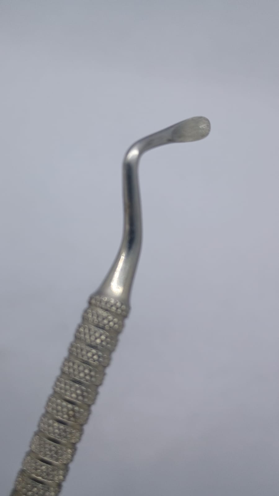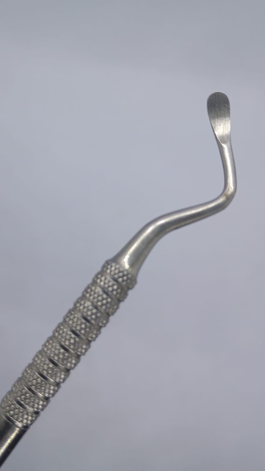 É fabricada em aço inoxidável cirúrgico, possui ponta em formato de colher (oval/côncava) e é indicada tanto para uso clínico quanto acadêmico.