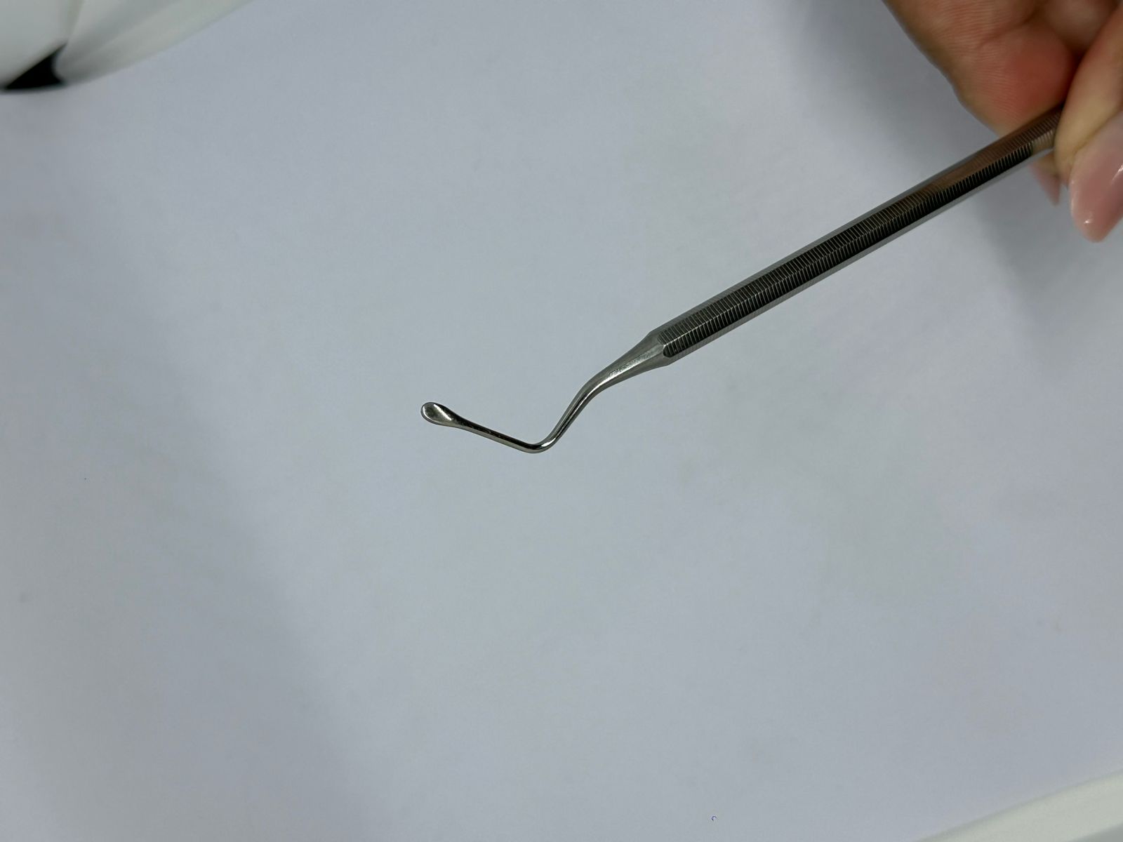 O escavador de dentina** é um instrumento manual usado na remoção mecânica de dentina cariada durante procedimentos restauradores. Possui pontas ativas arredondadas e cortantes, que facilitam a raspagem do tecido cariado amolecido, especialmente em áreas de difícil acesso.