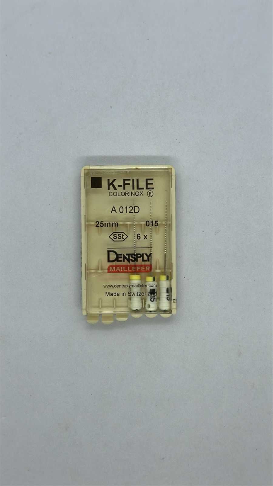 Lima K-File Dentsply 25 mm calibre 015, indicada para instrumentação manual de canais radiculares. Permite modelagem inicial com segurança e sensibilidade tátil elevada.