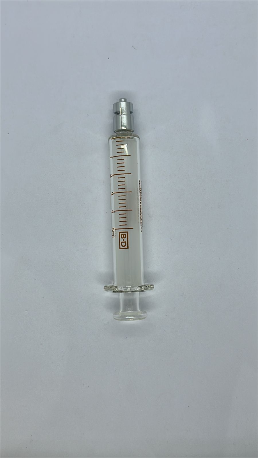 Seringa metálica reutilizável, usada para irrigação ou aplicação de medicamentos, com bico removível e sistema intercambiável.